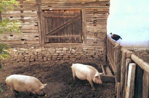 pigs-sty-two-muddy-pig-farm-situated-rural-transylvania-romania-bird-sitting-fence-overlooking-trough-44013725