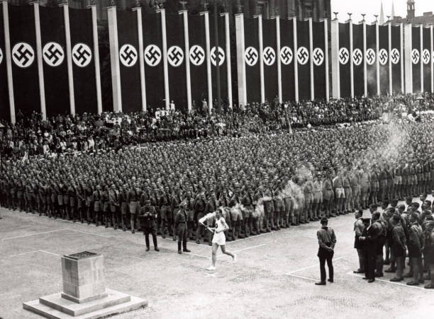 The Olympic torch is carried into the stadium during the opening ceremonies of the XI Olympic Games at the Olympic Stadium in Berlin, Germany, on August 1, 1936. (Photo by Getty Images)