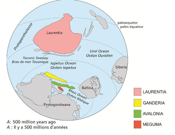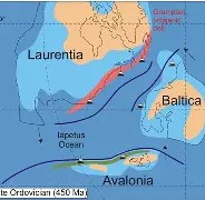 In Yellow, West Avalonia and East Avalonia on Opposite Continents Due to Division by Emerging Atlantic Ocean, Bisected by Mid-Atlantic Rift South of Iceland.